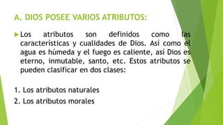 Este documento describe los principales atributos de Dios. Explica que Dios es omnisciente, lo que significa que sabe todo; omnipotente, lo que significa que tiene poder absoluto; y omnipresente, lo que significa que está presente en todas partes. Además, señala que los atributos de Dios se pueden clasificar en naturales y morales.