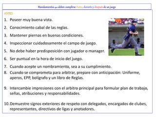 Este documento proporciona mandamientos para árbitros antes, durante y después de un juego, incluyendo inspeccionar el campo, mantener la disciplina durante el juego sin distracciones externas, y retirarse tras el juego sin interactuar con los equipos.