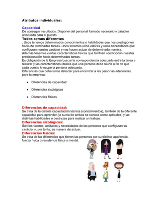 Este documento describe las diferencias individuales entre las personas que son relevantes para la selección de personal en una empresa. Explica que las personas difieren en su capacidad, características psicológicas y físicas, y que es importante que una empresa asigne a cada persona el puesto que mejor se adapte a sus fortalezas. También señala que aunque sea posible realizar una selección adecuada de personal, es posible que no realicen el esfuerzo de trabajo requerido si no se sienten estimulados, y destaca la importancia de la motivación