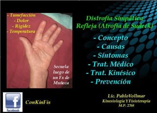 La Distrofia simpática refleja o Enfermedad de Sudeck o Sx Doloroso Regional Complejo es una patología tremendamente dolorosa que se caracteriza por presentar Dolor, inflamación, rigidez articular en Manos o Pies. Suele aparecer luego de episodios traumáticos ya sea fracturas, esguinces, operaciones , heridas, accidentes con armas de fuego. Es de dificil diagnóstico médico y a la vez pueden verse fisioterapeutas En ocasiones que confunden esta patología con problemas normales por ejemplo luego de sacado un yeso ya sea por fractura de muñeca o en tobillo pensando que esa rigidez, tumefacción y dolor son propios del estado de inmovilización, una de las formas de darnos cuenta es ver como el paciente en vez de mejorar va empeorando conforme pasan las sesiones y vemos como esa mano o pie aumenta de volumen propio de la inflamación y el dolor además de su rigidez. Por tal motivo es importante la consulta al paciente al médico cuanto antes para descartar o no esta patología que presenta 3 estadíos principales y el tratamiento precoz tiene una alta resolución favorable del 70%. No se conoce aún la causa pero se cree que se produce de manera involuntaria y actuando el sistema nervioso simpatico. La kinesiología es de gran ayuda para disminuir la inflamación y el dolor, el DLM es de vital importancia y el paciente que recibe sesiones de esta terapia manual puede disminuir el dolor en un 60%, seguido a eso las elongaciones suaves y movilizaciones de las articulaciones afectadas, como en las manos los dedos van a ir rígidos a flexión, se elongarán los flexores de mano y pie. En esta patología esta contraindicado el calor ya sea superficial como el infrarrojo o profundo como el onda corta, debido a que el paciente generalmente presentará además de tumefacción, temperatura y ardor en la zona. El tiempo de rehabilitación varía de persona en persona debido al estadiío, inflamación, dolor y rigidez que presente pero como promedio puede demorar de 3 a 9 meses dependiendo si fue tomada a tiempo, incluso el dolor puede disminuir y volver con el tiempo.