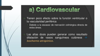 Este documento proporciona información sobre el uso del medicamento anticolinérgico en adultos y niños. Detalla las dosis recomendadas para su uso en preanestesia, bradicardia, asistolia, como antimuscarínico, antídoto de organofosforados e inhibidores de colinesterasa, broncoespasmo, oftálmico y reanimación cardiopulmonar. También especifica las dosis para niños en preanestesia, broncodilatación, reanimación cardiopulmonar, y tratamiento de intoxicación por