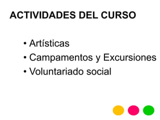 El documento describe un curso que combina actividades artísticas, campamentos y voluntariado social para fomentar una cultura viva y un sentido humanista en los participantes. Utiliza la filosofía como eje central para promover valores como la solidaridad, el liderazgo y el trabajo en equipo, permitiendo a los estudiantes descubrir su verdadero potencial. Se enfatiza la importancia del servicio y el esfuerzo personal como medio para generar un cambio positivo en el mundo.