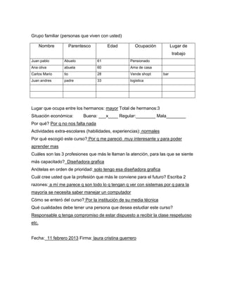 Este documento presenta un formato para hoja de vida de estudiantes que incluye información personal como nombre, dirección, lugar y fecha de nacimiento, estado civil y documento de identidad. También incluye datos académicos como el último año aprobado, el colegio y si ha estudiado en el SENA, así como información sobre la especialidad a la cual ingresa. Finalmente, presenta detalles sobre la situación familiar, económica y laboral del estudiante.