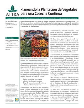 El documento proporciona información para ayudar a los cultivadores a planear plantaciones sucesivas de vegetales con el fin de ofrecer una cosecha continua a lo largo de la temporada de crecimiento. Explica factores como fechas de siembra, duración del cultivo, y condiciones climáticas que deben considerarse para lograr una producción constante de vegetales frescos para los mercados. También incluye una tabla con rangos de temperatura óptimos para la germinación de diferentes cultivos y un gráfico de muestra para registrar plantaciones planific