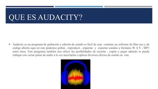 Audacity es un programa de código abierto gratuito para grabar, editar y mezclar sonido. Permite grabar audio en vivo, importar y exportar archivos de audio en formatos como WAV y MP3, y ofrece herramientas para editar sonido como cortar, copiar y pegar secciones de audio. También permite aplicar efectos de sonido y trabajar simultáneamente con múltiples pistas de audio.