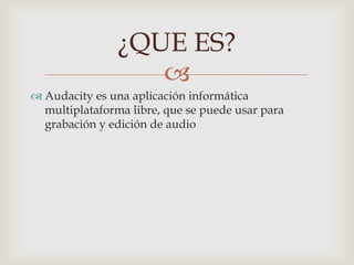Audacity es una aplicación de código abierto multiplataforma que permite la grabación y edición de audio, incluyendo la grabación en tiempo real, edición de múltiples pistas, conversión entre formatos de audio como MP3 y WAV, e importación de archivos MIDI y RAW. También permite agregar efectos de sonido y usar complementos para ampliar su funcionalidad.