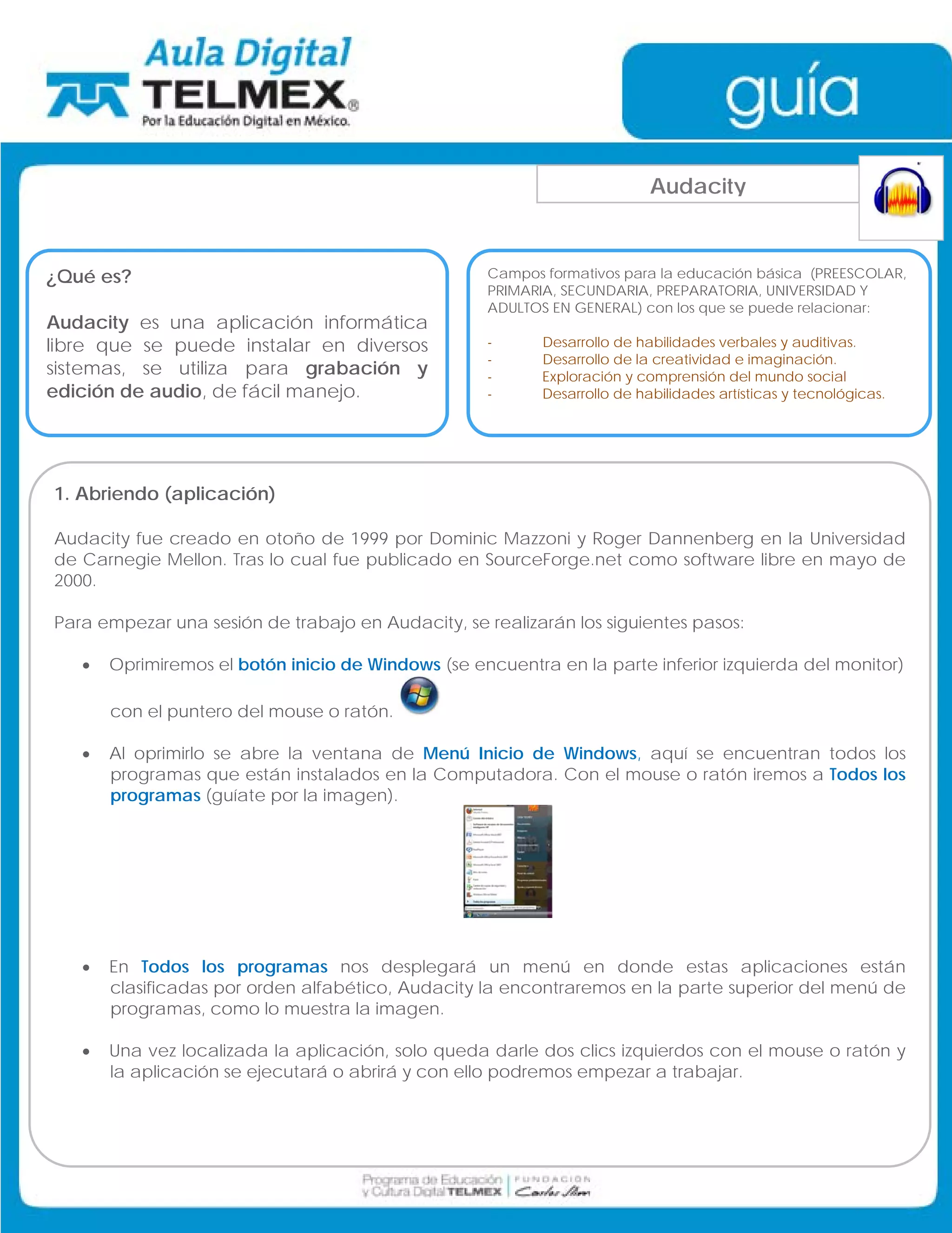 Audacity es una aplicación de código abierto gratuita para grabar y editar audio. Se puede usar para desarrollar habilidades verbales, creativas y artísticas. El documento explica cómo abrir Audacity, sus características principales como la grabación y edición de múltiples pistas de audio, y un tutorial paso a paso para grabar, editar y exportar un archivo de audio como MP3.