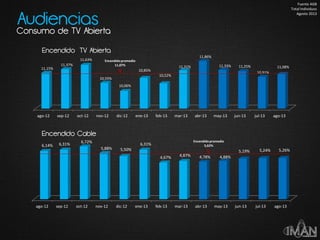 En agosto de 2013, Venevisión lideró las audiencias con un 52% de share, destacándose el certamen de Miss Venezuela como el programa más visto del mes. Televen mostró un decremento significativo en su rating, quedando por debajo de Venevisión, quien incrementó su audiencia en comparación al mes anterior. A su vez, TVES sufrió una caída considerable debido a la falta de eventos atractivos en su programación.