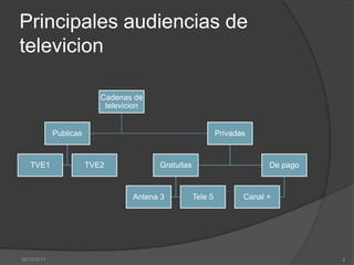 El documento presenta datos sobre los niveles de audiencia de los principales canales de televisión en España entre las 22:00 y 24:00 horas. Muestra las cifras de audiencia de cada canal por día de la semana y en total, con TVE1 teniendo la mayor audiencia en general y los días laborales, mientras que los canales privados tienen más audiencia los fines de semana. Finalmente, presenta gráficos comparando la audiencia por canal y día de la semana.