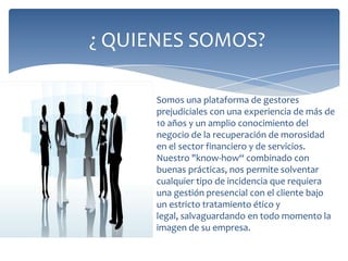 udigexper es una plataforma de gestores prejudiciales con más de 10 años de experiencia en la recuperación de morosidad en el sector financiero y de servicios. Ofrece servicios de gestión amistosa, recuperación de bienes, auditorías de control de stocks y peritaciones judiciales, adaptándose a las necesidades de sus clientes, que incluyen entidades bancarias y aseguradoras. Su enfoque ético y profesional destaca, asegurando una gestión eficaz de deudores en toda la península ibérica y islas.