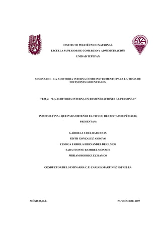 Este documento presenta un informe final sobre la auditoría interna en remuneraciones al personal. Se divide en cuatro temas principales: 1) el control interno en el departamento de recursos humanos, 2) el control interno en nóminas, 3) el control interno en el departamento de tesorería, y 4) un caso práctico. Incluye secciones sobre la autorización de contrataciones, expedientes de trabajadores, incidencias en nóminas, sistemas y procesos de cálculo y pago de nóminas, y registro contable