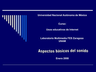 El documento habla sobre aspectos básicos del sonido como qué es el sonido, la frecuencia, el decibelio, los niveles de sonido perjudiciales, la velocidad de propagación del sonido, el eco, la reverberación, la resonancia, la altura y el timbre de un sonido, el efecto Doppler y la digitalización del sonido. También describe formatos comunes de archivos de sonido como WAV, MPEG, MIDI y RealAudio.