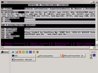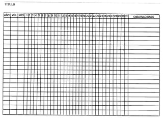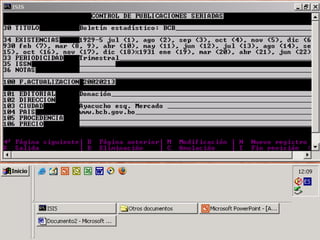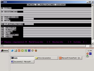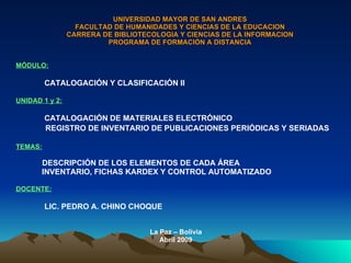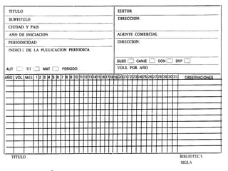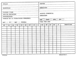 Este documento describe los elementos clave para catalogar materiales electrónicos como publicaciones periódicas y seriadas. Explica las áreas principales para incluir en un registro de catalogación como título, edición, descripción física, serie y notas. También cubre el inventario de estas publicaciones, el uso de fichas Kardex y el control automatizado.