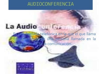 Este documento describe las características y beneficios de las audioconferencias. Explica que una audioconferencia permite que una persona llame a más de una persona al mismo tiempo para comunicarse de forma auditiva. Detalla los tipos de diseños de audioconferencias, los beneficios como aumentar la productividad y reducir costos, y cómo se usan comúnmente las audioconferencias en México.