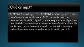 Este documento define y explica brevemente varios formatos de audio y video comunes, incluyendo MP3, WMA, MPEG, 3GP, AVI, WMV, VCD y SVCD. MP3 es un formato de compresión de audio digital con pérdida que reduce el tamaño de archivo, mientras que WMA es un formato de audio desarrollado por Microsoft. MPEG establece estándares para audio y video, 3GP almacena audio y video en teléfonos móviles, y los otros formatos como AVI, WMV, VCD y SVCD almac
