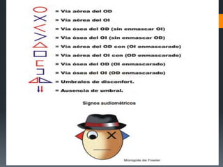 La audiometría es una prueba objetiva que permite establecer el umbral o mínima capacidad auditiva de cada oído a través de la vía aérea y ósea en diferentes frecuencias. Mide las alteraciones de la audición en respuesta a estímulos acústicos y permite diagnosticar hipoacusias sensoriales, conductivas o mixtas. El audiómetro genera tonos puros de diversas frecuencias e intensidades que son transmitidos a través de auriculares, y el paciente indica cuando puede o no escuchar cada tono