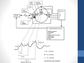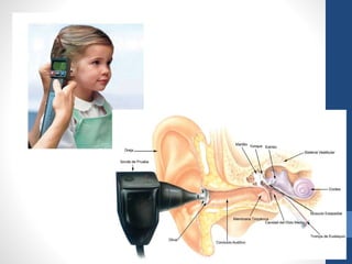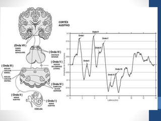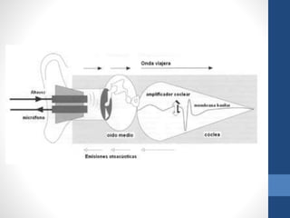 Este documento describe varias pruebas audiológicas objetivas, incluida la audiometría de tonos puros, la impedanciometría, las respuestas auditivas evocadas y las emisiones otoacústicas. Estas pruebas miden la sensibilidad auditiva, la integridad del oído medio, la función del sistema auditivo central y periférico de manera fiable y cuantitativa para diagnosticar con precisión problemas de audición. Las pruebas son útiles para evaluar la audición en niños, adultos y en situaciones