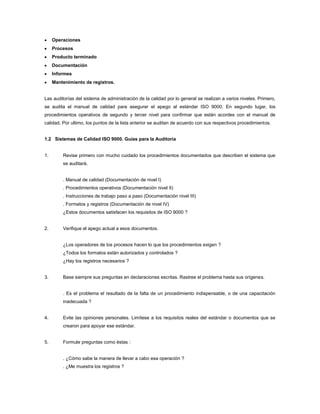 Este documento presenta una lista de verificación detallada para realizar auditorías internas de sistemas de gestión de calidad. La lista incluye puntos para revisar documentación, procedimientos, registros, equipos, capacitación del personal, auditorías previas y más. El objetivo es evaluar objetivamente el sistema de gestión de calidad de acuerdo con los requisitos de la norma ISO 9000. La lista proporciona una guía específica para auditar todos los aspectos clave de la organización.