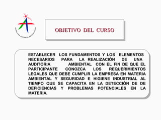El documento describe el objetivo de un curso de auditoría ambiental. El objetivo es establecer los fundamentos y elementos necesarios para realizar una auditoría ambiental para que los participantes conozcan los requisitos legales ambientales y de seguridad e higiene que debe cumplir una empresa, y se capaciten en la detección de deficiencias y problemas potenciales. El programa del curso incluye conceptos básicos, marco jurídico y estudios de caso.
