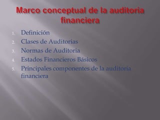 El documento define la auditoría como un proceso sistemático para obtener y evaluar evidencias relacionadas con informes sobre actividades económicas. Describe tres tipos de auditoría: interna, externa y gubernamental. Explica los estados financieros básicos y tres normas de auditoría. Finalmente, señala que los principales componentes de una auditoría financiera son aquellos con importancia monetaria, materialidad y variaciones significativas entre períodos.