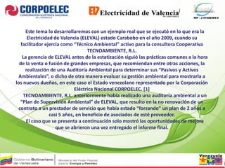 La auditoría ambiental realizada en dos plantas de generación eléctrica en Venezuela tuvo los siguientes hallazgos clave: 1) Residuos peligrosos almacenados de forma inadecuada, 2) Contaminación de cuerpos de agua, 3) Condiciones de trabajo inseguras. El informe final recomendó mejorar los procesos de almacenamiento, tratar los efluentes, y aumentar la seguridad laboral para cumplir con la normativa ambiental.