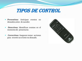 Este documento describe los diferentes tipos de controles internos como preventivos, detectivos y correctivos. Explica que los controles preventivos son más rentables ya que evitan problemas antes de que ocurran. Los controles detectivos miden la efectividad de los preventivos e incluyen revisiones y conciliaciones. Los controles correctivos comprenden acciones rectificatorias y documentación sobre supervisión de asuntos. Finalmente, señala que los controles internos pueden ayudar a una organización a lograr sus metas y objetivos.