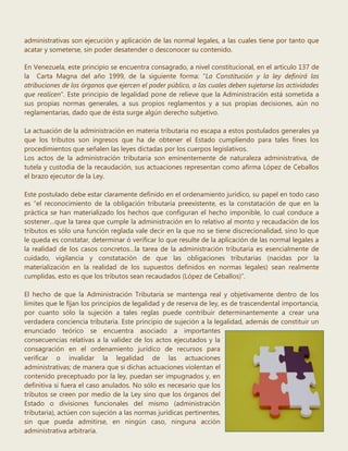 El principio de legalidad tributaria establece que la administración tributaria debe sujetarse a las normas jurídicas y leyes dictadas por los cuerpos legislativos. Este principio implica que las actuaciones administrativas deben emanar de y acatar las leyes. En Venezuela, este principio se encuentra consagrado en la Constitución y establece que la administración está sujeta a sus propias normas y decisiones. La administración tributaria no escapa a este principio general y sus actuaciones deben limitarse a aplicar y hacer cumplir las leyes tributari