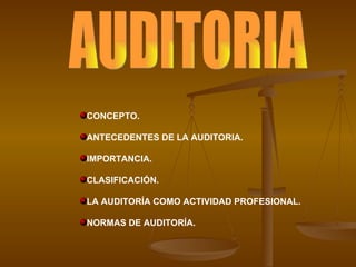 El documento habla sobre los antecedentes, importancia y clasificación de la auditoría como actividad profesional. Explica que la auditoría surgió en el siglo XIX en Inglaterra para evitar fraudes contables y desde entonces ha ido creciendo en importancia. También clasifica las auditorías por su alcance, naturaleza, tiempo de realización y personas que la practican. Finalmente, señala que las normas de auditoría establecen los requisitos mínimos de calidad para el auditor y su trabajo.