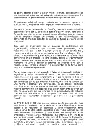 El documento discute los problemas que surgen en los procesos de certificación en seguridad y salud ocupacional debido a la interpretación individual que los auditores dan a las normas. Si bien las normas establecen objetivos y requisitos generales, permiten flexibilidad en cómo las empresas cumplen con ellos. Sin embargo, los auditores a menudo exigen formas específicas que van más allá de lo establecido en las normas y no permiten argumentar alternativas válidas. Esto convierte el proceso de certificación en algo rígido en lugar de un di