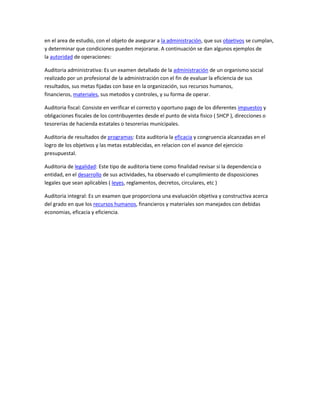 La auditoría se define como el examen de los registros patrimoniales de un individuo o empresa para verificar su estado financiero. Existen dos tipos de auditoría: externa, realizada por un contador público ajeno a la empresa, e interna, realizada por el personal de la empresa. El análisis de estados financieros evalúa la posición financiera pasada y presente de una empresa para establecer predicciones sobre su futuro.