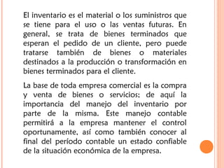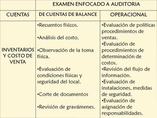 El documento habla sobre el proceso de auditoría del ciclo de inventarios y almacenaje. Explica que este ciclo analiza las transacciones relacionadas con el inventario como su almacenamiento, registro de costos, y salidas. Además, describe los objetivos de la auditoría como evaluar los saldos de cuentas relacionadas y verificar la existencia e integridad del inventario. Finalmente, resalta la importancia de la observación física del inventario para determinar su existencia y valuación.