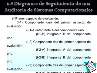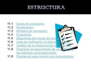 Este documento proporciona una guía detallada para la evaluación de sistemas computacionales. Describe múltiples técnicas de evaluación como diagramas de flujo, modelos de simulación, listas de verificación y análisis de diagramas. Además, detalla los aspectos a evaluar en áreas como la administración del sistema, seguridad, operaciones y desarrollo de software. El propósito es brindar al auditor una metodología estructurada y herramientas específicas para realizar una evaluación exhaustiva de todos los component