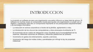 Este documento proporciona información sobre licenciamiento de software. Explica los beneficios de implementar un programa de administración de software, incluyendo ahorro de costos, reducción de riesgos legales y mejora en el soporte técnico. También describe el proceso de auditoría de software, el cual incluye preparación, trabajo de campo, generación de informes y acciones correctivas. Finalmente, distingue entre licencias OEM, Retail y de volumen para Windows.