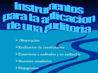 El documento describe diferentes instrumentos utilizados en las auditorías como la observación, cuestionarios, entrevistas, muestreo y flujogramas. Explica brevemente cada uno de estos instrumentos y cómo se usan para recopilar información durante una auditoría.