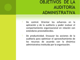 Este documento describe los conceptos y objetivos de una auditoría administrativa, así como las normas y procedimientos que debe seguir un auditor. Explica que una auditoría evalúa el desempeño y oportunidades de mejora de una organización, y que sus objetivos incluyen el control, la productividad, la calidad y el aprendizaje institucional. También detalla las normas de ejecución, documentación, riesgo y planeación que un auditor debe aplicar para realizar una auditoría de manera efectiva.