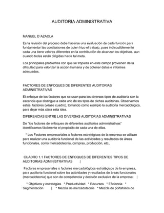 El documento describe los diferentes tipos de auditorías administrativas, incluyendo los factores que se consideran en cada una y el proceso general de realización de una auditoría administrativa. Explica que una auditoría administrativa evalúa procesos, funciones y resultados para determinar problemas y oportunidades de mejora. Además, detalla las etapas de planeación, organización, ejecución, informe y seguimiento que debe seguir una auditoría administrativa para ser efectiva.