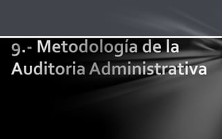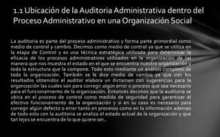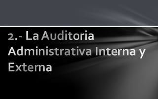 La auditoría administrativa se ubica en la etapa de control del proceso administrativo y tiene como objetivo evaluar la estructura, sistemas y procesos de una organización para determinar su efectividad y proponer mejoras. La auditoría interna es realizada por personal de la empresa y se enfoca en evaluar los controles internos, mientras que la auditoría externa es llevada a cabo por individuos ajenos a la organización para obtener una perspectiva más objetiva. Ambas buscan mejorar la eficiencia y eficacia operativa de una entidad.