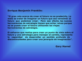 El documento discute la importancia de imaginar un futuro verosímil y crearlo utilizando nuevas herramientas estratégicas en lugar de las viejas. También enfatiza la necesidad de desarrollar una profunda comprensión de las discontinuidades para crear una jerarquía de imaginación que permita manejar el cambio. El libro presenta un marco integral para la auditoría administrativa que integra conceptos, áreas de aplicación, enfoques organizacionales y herramientas.