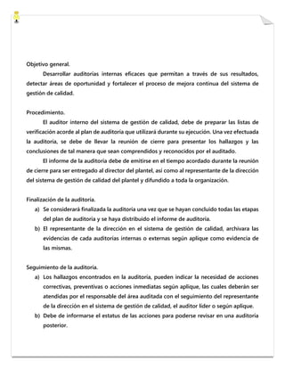 La auditoría interna del Cecytej No. 10, dirigida por el Ing. Benjamín Quintanar Ortega, tiene como objetivo desarrollar auditorías eficaces que identifiquen áreas de mejora en el sistema de gestión de calidad. Los procedimientos incluyen la preparación de listas de verificación, la presentación de hallazgos en reuniones de cierre y la distribución de informes a la dirección. Se detectaron diversas inconsistencias en procedimientos, con algunos hallazgos resueltos y otros abiertos, destacando la importancia del seguimiento para la mejora continua del sistema.