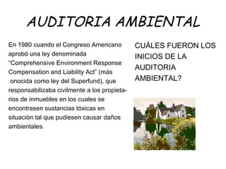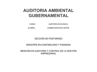 El documento presenta una guía de auditoría ambiental gubernamental. Explica que la Contraloría General de la República del Perú aprobó esta guía en 2008 para estandarizar los procedimientos de auditoría ambiental gubernamental. La guía establece lineamientos y metodologías para este tipo de auditorías siguiendo un enfoque de mejora continua que incluye las fases de planificación, ejecución, verificación y seguimiento. También define los tipos de auditoría ambiental y los principios que deben guiar estas auditorías, incl