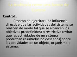 El documento describe los conceptos fundamentales del control interno y la auditoría. Define el control interno como un proceso de influencia sobre las actividades de una organización para asegurar que se cumplan los objetivos definidos. Explica los tipos de control y los objetivos, factores de riesgo y métodos de evaluación del control interno. Además, describe los principios y procedimientos de la auditoría como herramienta de control.