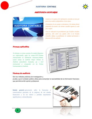 Este documento describe diferentes tipos de auditoría y técnicas de auditoría. La auditoría contable consiste en examinar los estados financieros de acuerdo con las normas contables aplicables y emitir una opinión sobre si reflejan razonablemente la situación financiera de la entidad. Las técnicas de auditoría incluyen análisis de movimientos, inspección y confirmación para verificar la información. La auditoría informática audita los sistemas de información para validar los procesos y resultados automatizados.