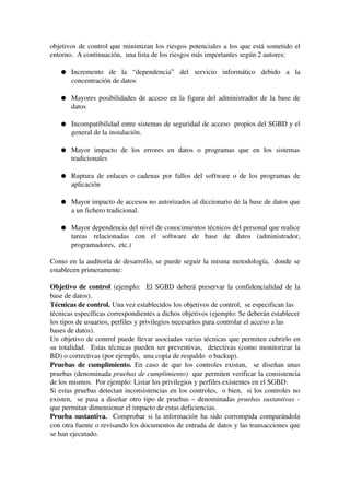 El documento aborda metodologías y procesos para la auditoría de bases de datos, enfatizando la importancia del control interno y la evaluación de riesgos. Describe las fases de auditoría, desde la concepción y diseño hasta la explotación y mantenimiento, así como la necesidad de establecer un estudio de viabilidad y un plan de trabajo riguroso. Se resalta la relevancia de la revisión post-implantación para asegurar que se cumplan los objetivos y beneficios esperados.