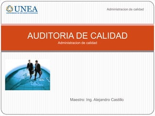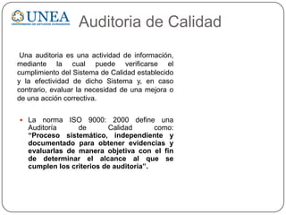 Este documento describe la auditoría de calidad, definida como un proceso sistemático para evaluar objetivamente el cumplimiento de criterios de calidad. Explica que una auditoría verifica el cumplimiento del sistema de calidad establecido y su efectividad, identificando áreas de mejora. También describe los tipos de auditorías, como las internas realizadas por la propia organización y las externas realizadas por terceros, así como las auditorías de adecuación y cumplimiento. El objetivo final es evaluar la suficiencia y efectividad de los procesos