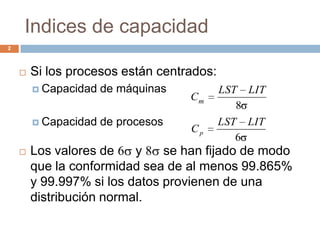 El documento habla sobre los índices de capacidad de maquinaria, proceso y calidad. Explica que los índices de capacidad miden la habilidad de un proceso para producir resultados dentro de los límites especificados y discute valores comunes para dichos índices. También describe diferentes tipos de auditorías de calidad como auditorías del sistema, política, organización, documentación, procesos y producto.