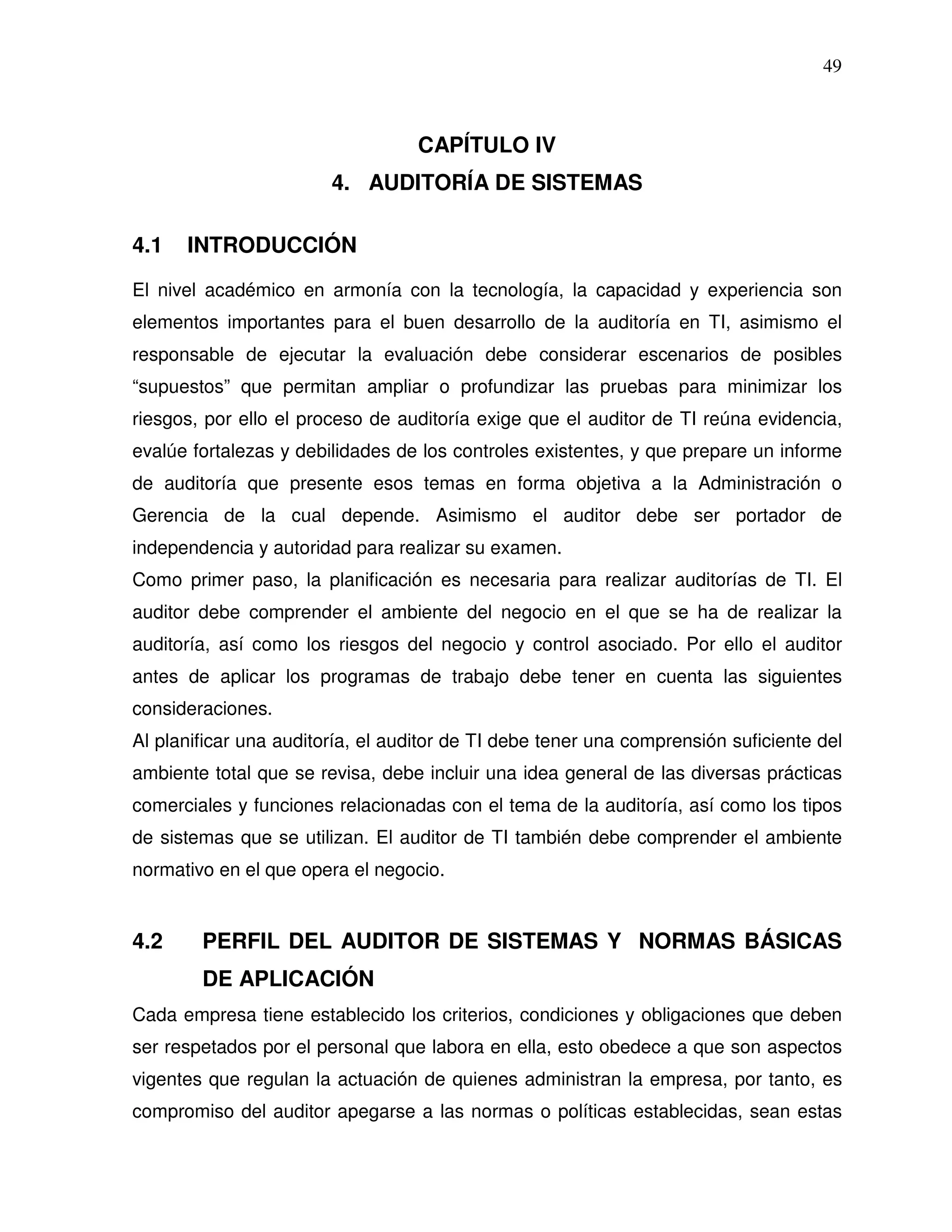 El documento habla sobre la auditoría de sistemas. Explica que el auditor debe comprender el ambiente del negocio y los riesgos asociados antes de planificar una auditoría. También describe los perfiles y normas básicas que debe cumplir un auditor de sistemas, incluyendo la independencia, integridad, objetividad y confidencialidad. Finalmente, discute sobre los riesgos y materialidad en una auditoría y algunas herramientas de soporte como software para auditoría.