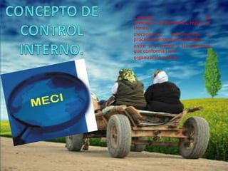 El documento presenta el MECI (Mecanismo de Control Interno) de una organización. El MECI consta de tres subsistemas: control estratégico, control de gestión y control de evaluación. El MECI se implementa en cuatro etapas: planeación, diseño, evaluación e institucionalización. El objetivo del MECI es establecer principios, procedimientos y mecanismos de control para ordenar y evaluar las acciones de la organización.