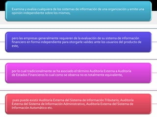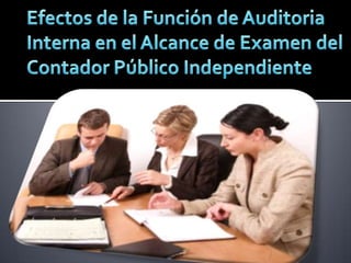 El auditor externo debe considerar las actividades de auditoría interna y evaluar si afectan los procedimientos de auditoría externa. La auditoría interna opera dentro de la organización para evaluar los sistemas contables y de control interno, mientras que el auditor externo emite una opinión independiente sobre los estados financieros. El trabajo de la auditoría interna puede ser útil para el auditor externo al determinar el alcance de sus procedimientos.