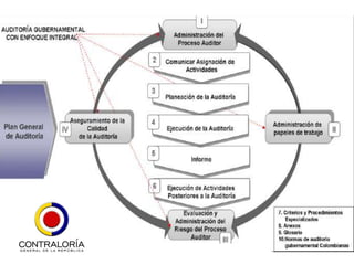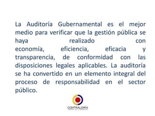 El documento describe la auditoría gubernamental, incluyendo su definición como la revisión de las operaciones gubernamentales para verificar el cumplimiento legal y la eficiencia. Explica los objetivos principales como evaluar el uso de recursos públicos y mejorar la gestión pública. También cubre las características y componentes básicos de la auditoría gubernamental como ser objetiva, dirigida por contadores, y concluir con un informe.