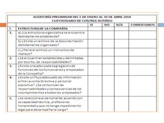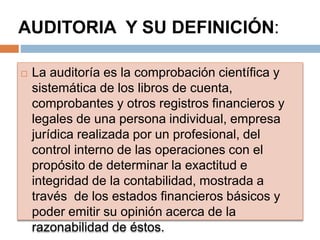 El documento define la auditoría y sus objetivos. Explica que la auditoría es la comprobación sistemática de los registros financieros de una entidad para determinar si los estados financieros presentan razonablemente su situación financiera. Detalla los tipos de auditoría interna y externa y los objetivos de cada una. Finalmente, describe las normas de auditoría generalmente aceptadas que rigen el trabajo del auditor.